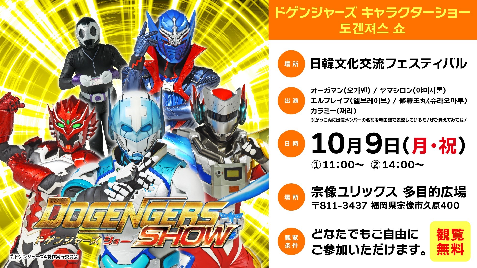 未就学児はご入場出来ません。 対象公演1日限り有効 雨天決行。 Festival in MUNAKATA(ライブ)、映画の入場には、別途チケットが必要です。 |